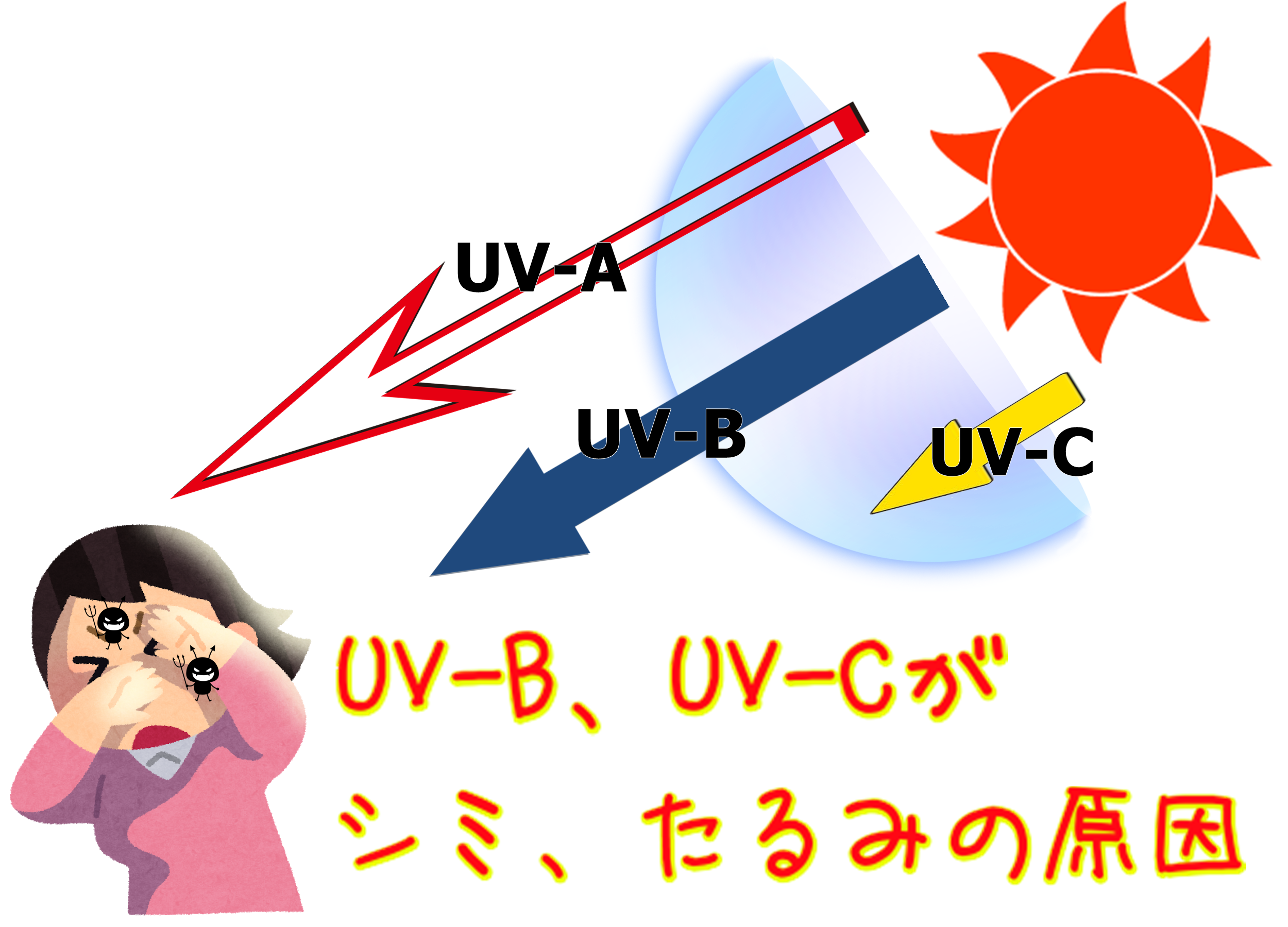 紫外線「UV-A」「UV‐B」がシミ、シワ、たるみの原因。